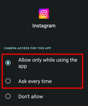 - In the Camera Permission settings, choose either ‘Allow only while using the app’ or ‘Ask every time.’